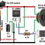 This is fun project for small Christmas Music Box Circuit using IC UM66. UM66 chip already has melody inside. When power ON, it plays Christmas notes. It is good for greeting cards, toys and mini gifts. Circuit Working: Parts List: Part Name Value Quantity Resistor 4.7k 1/4 watt 1 Capacitor Electrolytic 1uF 25V 1 Semiconductors […]