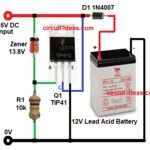 This is a Simple 12V Battery Charger Circuit using TIP41 Transistor. It uses one NPN power transistor TIP41 and one 13.8V Zener diode. The circuit is cheap, easy and safe for charging 12V lead acid battery. This circuit works for small 7Ah to 20Ah batteries. It is a good circuit for learning basic battery charging. […]