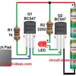 This article is about is a Simple Transistor Based Touch Switch Circuit. It works when finger touches the pad with no push button used. Human body gives small signal and circuit senses this signal. Two NPN transistors are used and one LED is used as output. Circuit works with only 3V supply which is very […]
