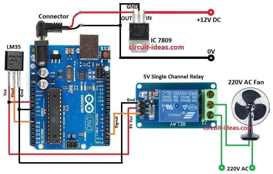 This above circuit for temperature control fan is simple to make, IC LM35 sensor has 3 pins: VCC, GND and analog out.