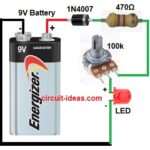 This project show how to Adjust LED Glow with Potentiometer Circuit. We used diode, resistor, battery and potentiometer. By turning potentiometer we can change voltage and LED brightness. Very easy to make and works with 9V battery. Circuit Working: Parts List: Component Specification Quantity Resistors 470Ω 1/4 watt 1 Potentiometer 100k 1 Semiconductors Diode 1N4007 […]